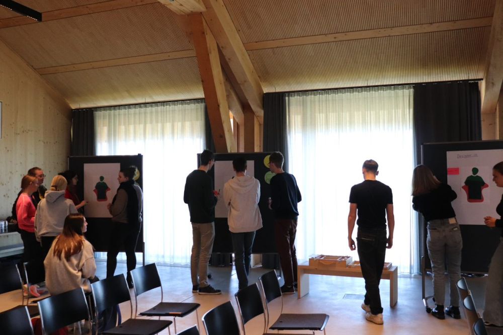 Gemeinsam erarbeiteten sich die Schüler an diesem Valentinstag 2023 dann anhand einer fiktiven Person engagiert Lösungsansätze für die Herstellung und das Design von Produkten und damit einen hoffnungsfrohen Ausblick auf Ihre Zukunft. Nach einem gesunden und sehr leckeren Mittagessen führten Herr Metzeler und Mario Grizelj von der Stiftung Nantesbuch durch das großartige, vom Münchner Architekten Florian Nagler entworfene, Lange Haus, das als Ort der Begegnung von Kunst und Natur verstanden werden will.