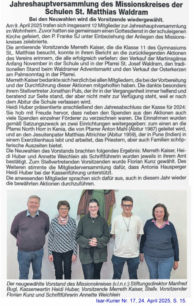 Der Missionskreis St. Matthias e.V. , der durch seine Tätigkeit ehemalige Schüler unterstützt, die nun in der südlichen Weltkugel bei der Entwicklung der Länder mitarbeiten, hat am Mittwoch., 9. April 2025 seine Jahreshauptversammlung abgehalten.